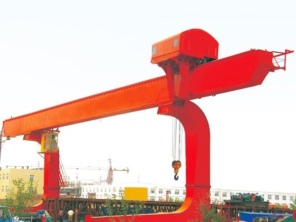 門架為箱形單主梁兩支腿結構,起重量20t以下時小車采用垂直反滾輪式,大于20t時小車采用水平反滾輪式,在主梁一側運行。主梁采用單梁偏軌形式,支腿與下橫梁組成L型,支腿兩側一般均帶有懸臂,吊運物品時過跨能力強,便于將物件從跨內轉運到懸臂下。小車為側面懸掛方式,吊具布置在主梁側面,起重量≤20t時采用垂直反滾輪二支點形式,起重量>20t時采用水平反滾輪三支點形式。